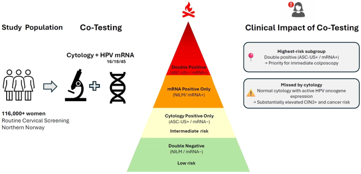 The study evaluated 116,217 cervical screening samples from Northern Norway, where cytology was combined with HPV E6/E7 mRNA testing targeting HPV16, HPV18, and HPV45 (PreTect SEE).